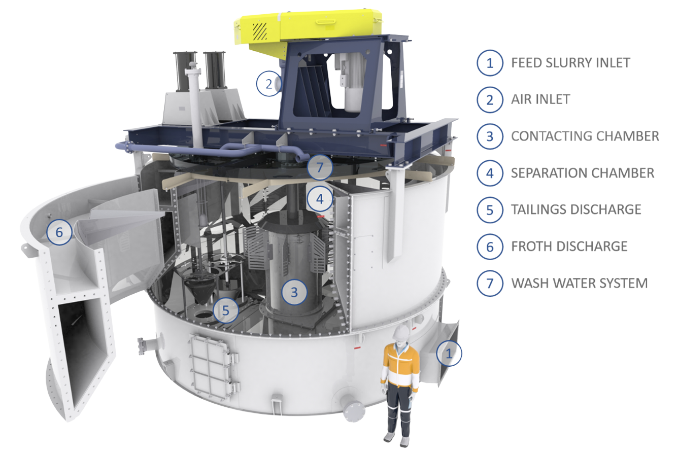 The StackCell high-intensity flotation machine features a high-turbulence bubble/particle contact chamber with multi-stage rotor/stator mechanism that feeds an external froth separation and recovery chamber.